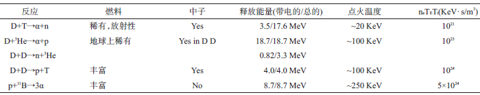 表2 几种主要的聚变反应以及实现聚变的劳逊条件