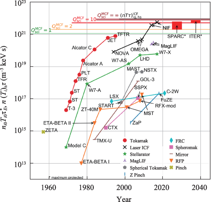 目前,全球范围内的聚变研究主要集中在磁约束聚变和惯性约束聚变两种主要的技术路径上。世界上的磁约束聚变装置主要有托卡马克、仿星器、磁镜三种类型;惯性约束聚变的主要方式是激光和Z箍缩。其中,磁约束聚变的最有代表性项目有国际热核聚变实验反应堆(ITER),而惯性约束聚变的代表性项目则有美国的国家点火装置(NIF)。在实现劳逊条件方面,激光聚变发展最快,美国NIF装置实现四次点火(能量增益大于1),最大聚变能量3.15 MJ,Q接近1.8。托卡马克D-T 聚变的参数最高是欧盟JET 装置,Q=0.65,最大聚变能量59 MJ。我国超导托卡马克EAST实现了超过一亿度可重复的400 秒高约束放电。图3 是过去50 年世界各国在聚变研究方面所取得的聚变三重积方面的进展。从图3 中可以看到激光NIF 参数最高,其次是托卡马克美国的TFTR装置。