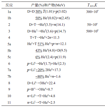 自然界存在多种聚变反应,主要的聚变反应都有轻核之间的相互反应,表1是目前主要的聚变反应。