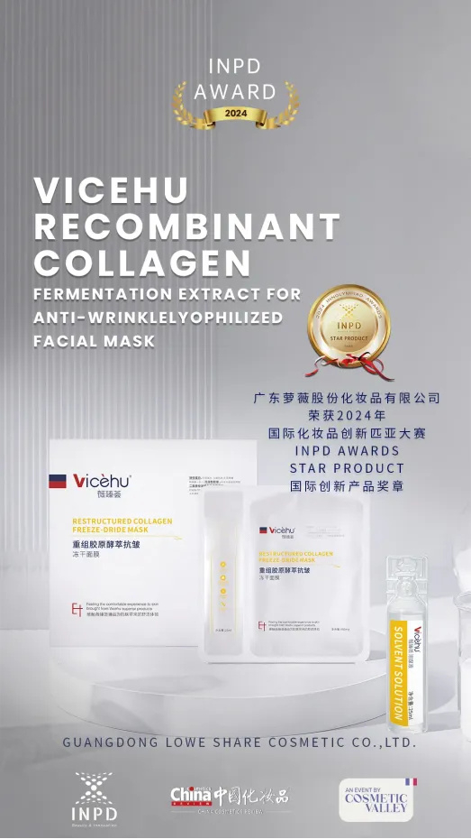 巴黎大赛最强黑马浮现——萝薇国际研发生产的高端纯净美妆品牌产品:薇臻荟重组胶原酵萃抗皱冻干面膜(简称冻干面膜),在70多个国家和地区的代表精英企业中杀出重围!荣幸斩获了“2024年国际化妆品创新匹亚大赛·INPD START PRODUCE(国际创新产品奖)”,这一殊荣显著地展示了萝薇国际在全球化妆品科学领域中遥遥领先的地位。