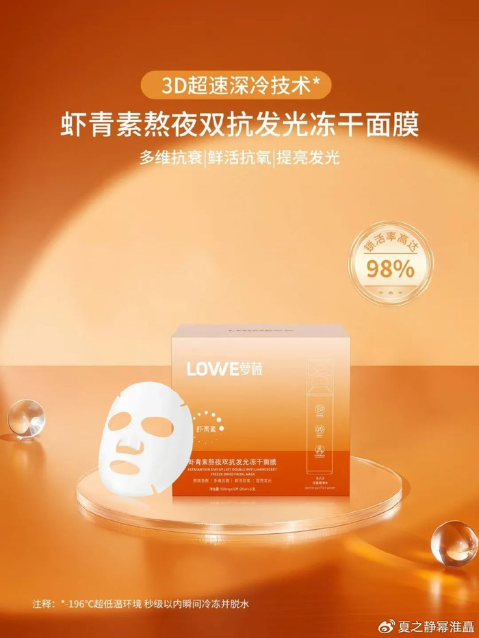 【虾青素熬夜双抗发光冻干面膜】运用了前沿工艺——冻干黑科技,通过3D超速深冷技术,在-196℃超低温环境下,使高浓度活性精华在秒级以内瞬间冷冻并脱水,降温至-40℃以下,锁活率高达98%以上。这种工艺能够更好地保存细胞结构、营养成分及生物活性,让面膜的多维抗衰、鲜活抗氧、提亮发光功效得到充分的发挥,为熬夜人群提供了优质的护肤选择。