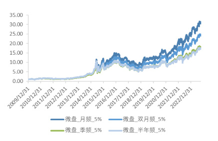 国海证券的一个测算,同样是市值最小的5%的微盘股,换仓频率越高的,收益就越高: