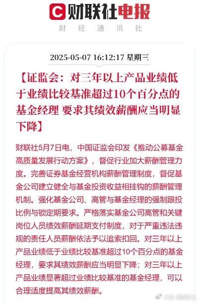 “对三年以上产品业绩低于业绩比较基准超过10个百分点的基金经理,要求其绩效薪酬应当明显下降;对三年以上产品业绩显著超过业绩比较基准的基金经理,可以合理适度提高其绩效薪酬”。