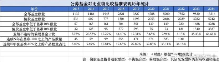 《财经》杂志根据Wind数据统计,2015年至2024年10年期间,以自然年计算业绩比较基准的超额收益,能够连续跑赢基准(三年期年度滚动)的偏股型基金仅有45只,占可统计偏股基金数量的8.4%;