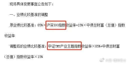 比如这只基金,原来的业绩比较基准是“85%×沪深300指数收益率+15%×中债总财富(总值)指数收益率”,现在变更为“中证TMT产业主题指数收益率×85%+中债总财富(总值)指数收益率×15%”。