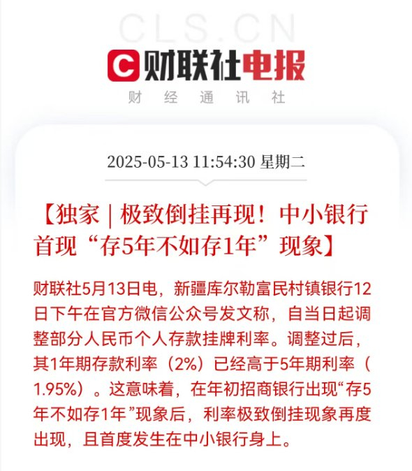 新疆某村镇银行出现1年期存款利率2%,5年期存款利率1.95%,存5年不如存1年。