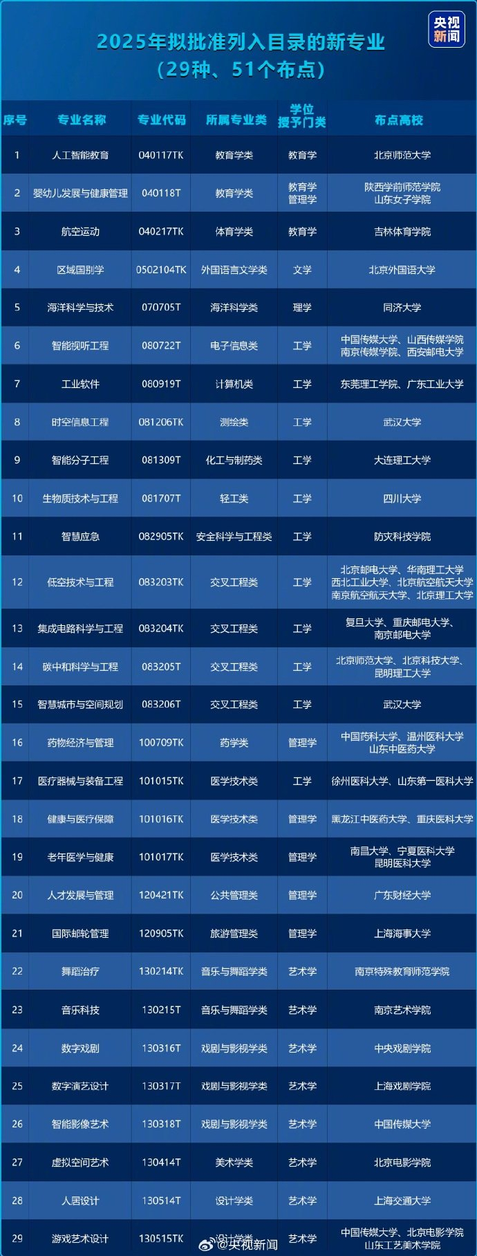 在教育部公布的《普通高等学校本科专业目录(2025年)》里,新增了29个专业,涵盖服务国家战略、科技发展、人工智能等方面。