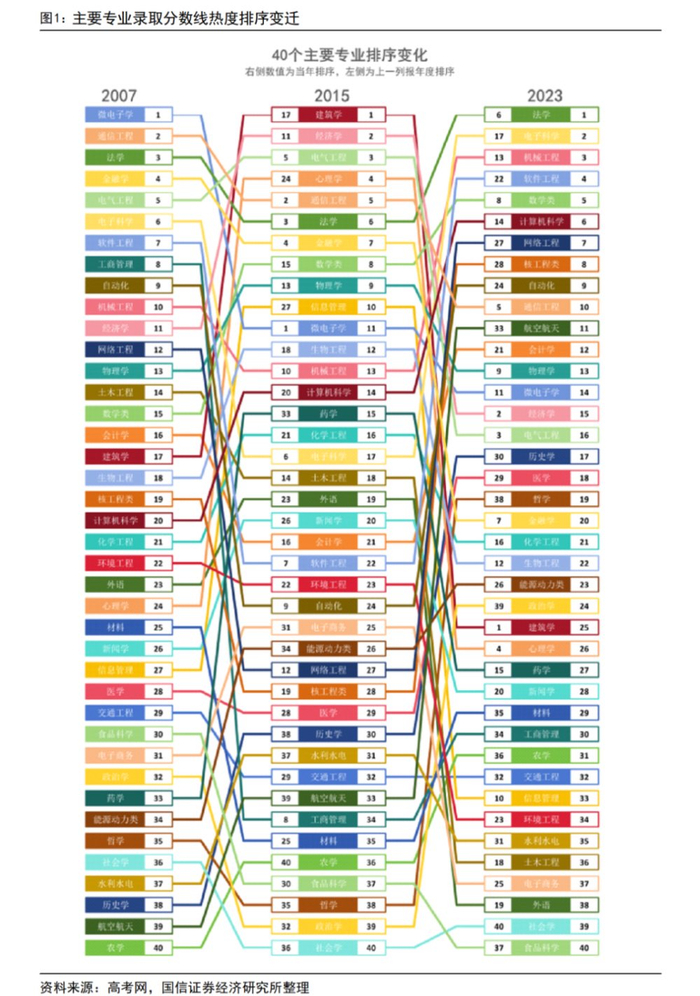 但2015年后,“中国制造2025”战略发布,房地产暴露经济结构问题,后面又开启供给侧改革启动,2018年贸易摩擦倒逼产业升级,产业结构发生巨大变化,互联网、AI、新能源等行业爆发,热门专业排序也随着大幅变化,土木建筑这些随着周期下行,计算机、电子科学随之崛起。