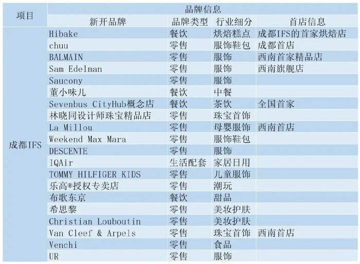 其中有上上瓷,包括Canada Goose、Mackage、MSGM、Sauvereign、Ulysse Nardin、Yves Salomon、Moncler童装店、Stella McCartney Kids、Tomacado、牛角烧肉等。全国首店西南首店