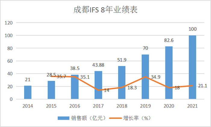 算下来,到2021年底,成都IFS的销售额了。已经连续8年实现双位数增长