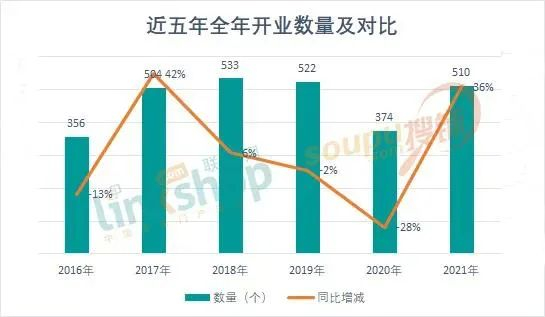 根据联商网,2021年新开业的商场有510家,2017年、2018年和2021年三年同比上涨,且2021年涨幅最大,达到了36%左右。