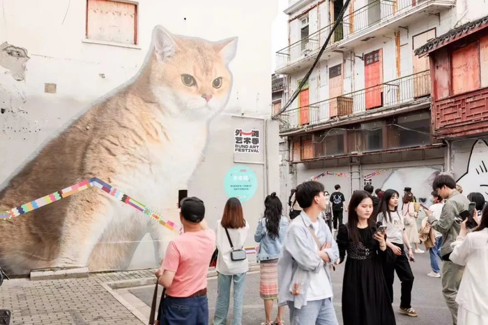在上海老街,以爱猫著称的艺术家、漫画家tango在墙面上创作了一幅幅萌态十足的喵咪,吸引了众多人前来拍照。