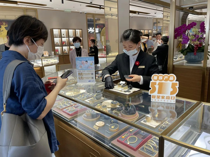 独角Mall在走访老庙黄金线下门店过程中,发现店内有不少客人。门店店员表示,最近正值“上海五五购物节”、“515复星家庭日”及“520”,不少消费者在支付宝领了优惠券前来门店咨询购买,平时到店的客人也会询问是否有新款产品及活动优惠。