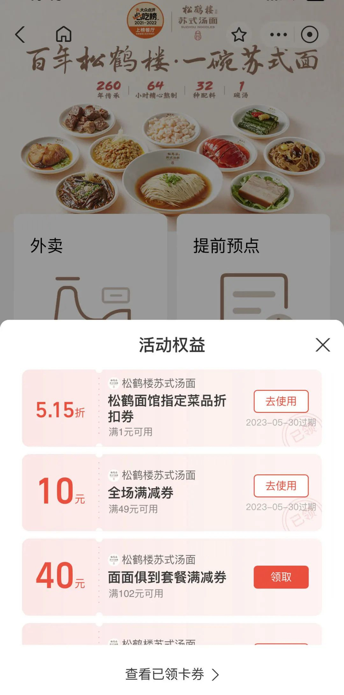 在上海老字号品牌松鹤楼上海BFC店,用支付宝扫码点餐时,优惠券直接就会弹出,不用再去查找,领取的优惠券在支付时也会直接核销。