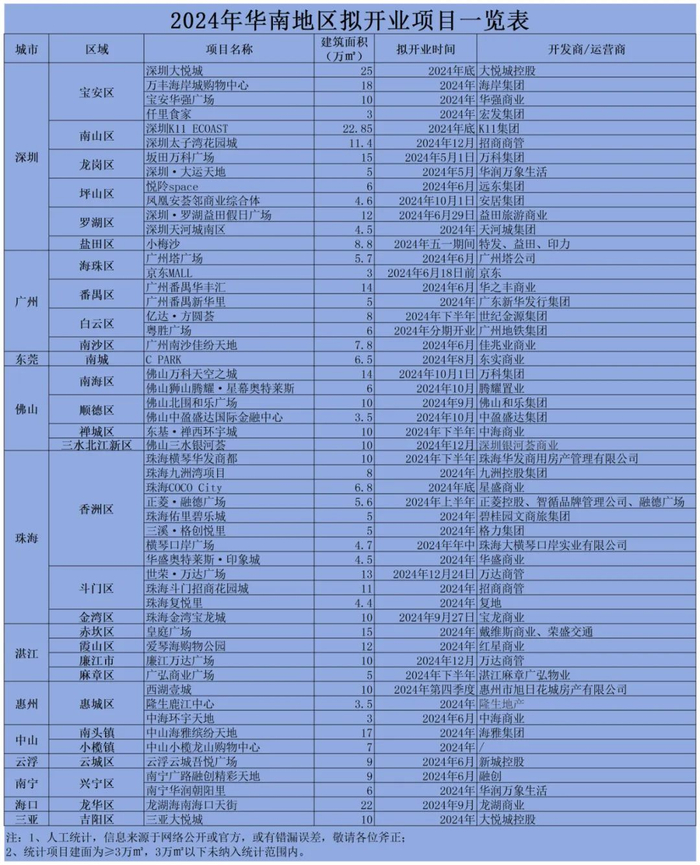 2024年筹开商业汇总继续,本篇为华南地区2024年拟开业项目情况。