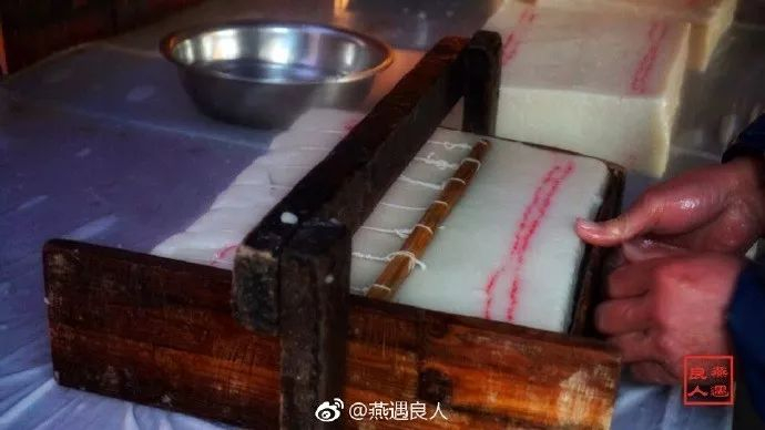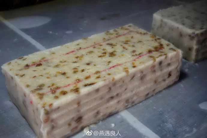 年糕出锅之后,如何分切也很有讲究。分割年糕不能用刀而要用线。因为新蒸的年糕特别黏,会黏在刀上,用线切割就非常利落。新切好的年糕菱角分明,扎实饱满,有些人家会再点上一些桂花做点缀,明亮精致,好吃又好看。