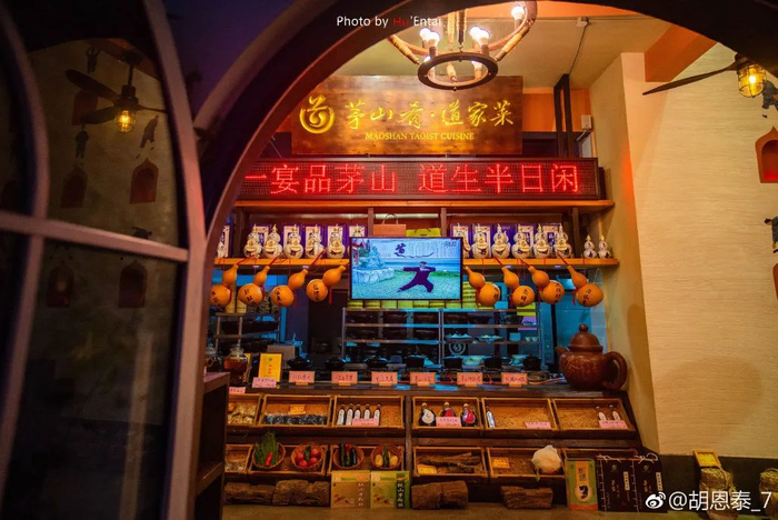 茅山肴·道家菜餐厅把“文化+餐饮+旅游”的现代休闲模式融入经营中,面向宾客,立足茅山,独具匠心。茅山肴•道家菜以茅山地方特色的食材原料为基础,以返朴养生的哲学思想为理念,以茅山地区民间传统饮食习俗为载体,运用本地传统的烹饪工艺,将各色茅山美味端上餐桌。餐厅的一菜一肴,都是茅山文化与养生膳食完美结合的精品。