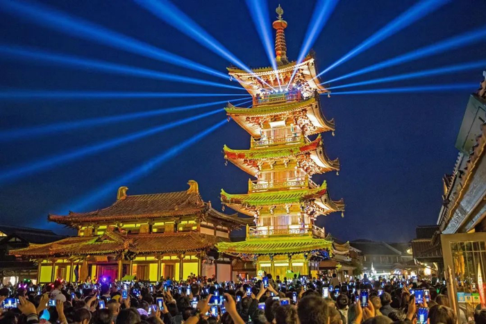 来马山游夜景,拈花湾自然是不可错过的绝佳打卡地。当夜幕降临,隆重庄严的拈花湾亮灯仪式开始。拈花塔由下到上变幻出七彩流光,塔楼霓虹闪烁,光芒四射,越发显得庄重。