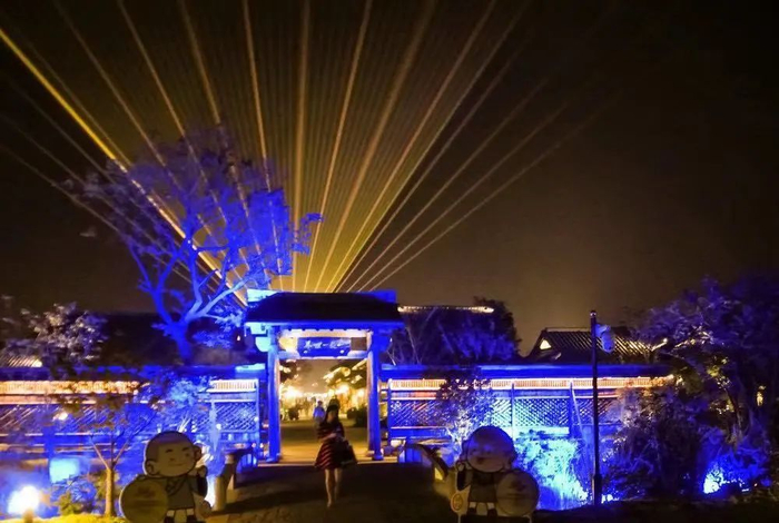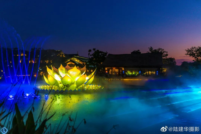 或者出香月花街,行至五灯湖畔,五灯湖上有灯光秀和放灯活动。在一位行者将花瓣撒向湖中后,湖面水幕莲花次第盛开,将写满愿望的花灯逐流而漂,绚丽之夜,惊艳妙极!