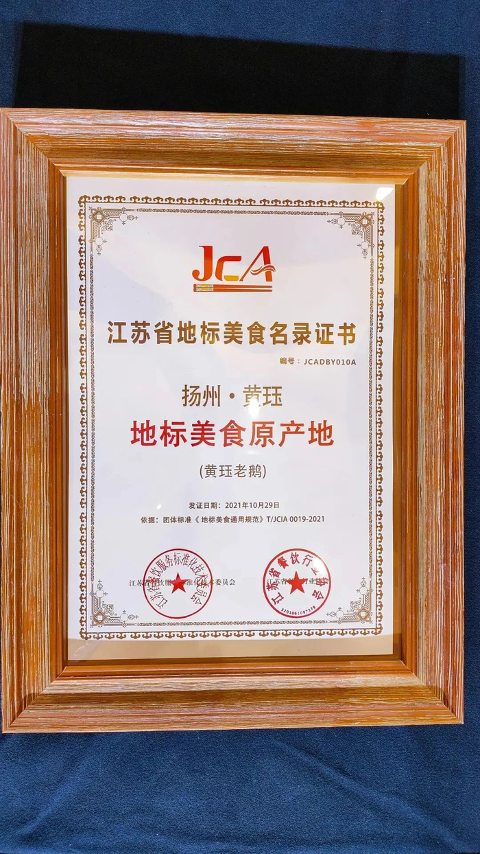 邗江区鹅业协会会长刘军介绍,据考证,自清朝中期联合村张姓人家首创盐水鹅制作,经过张氏几代人经营,影响力逐渐扩散开来;在上世纪80年代,“黄珏老鹅”正式冠名;2021年10月,扬州·黄珏(黄珏老鹅)被认定为江苏省地标美食原产地;如今,“黄珏老鹅”已遍布扬州城,市区各类店铺、熟食摊多达200余家,从酒店宴席到百姓餐桌,处处能见到色香味俱全的“黄珏老鹅”。