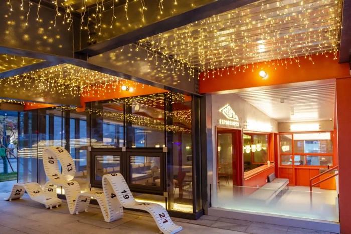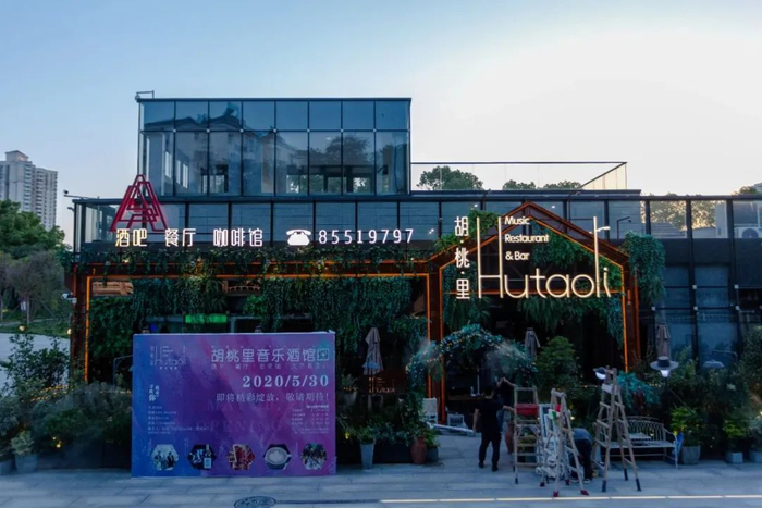 左边三栋玻璃墙体建筑物,林立着各种美食、酒吧、艺术展厅、咖啡店、非遗文化、VR体验、射箭馆等综合商业体,应接不暇!