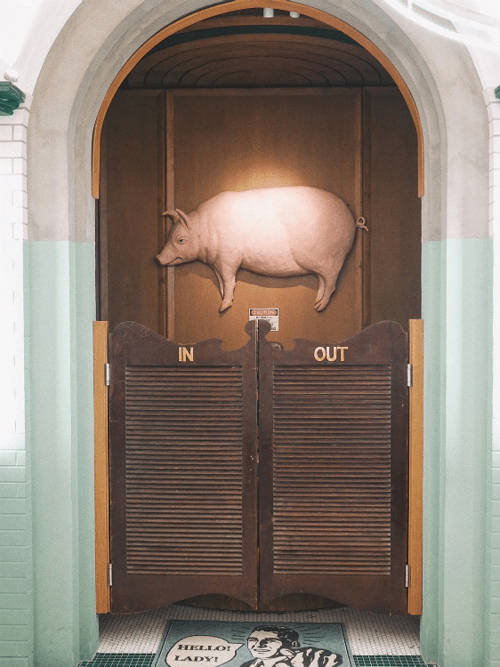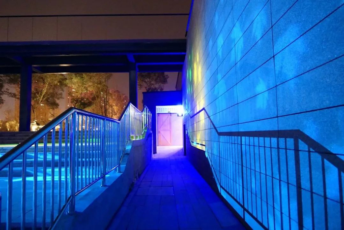 在街区中间的位置,就有这样一个很有气质的洗手间。乍一看还以为是一间酒吧的入口,这灯光氛围的走心设计也是没谁了。