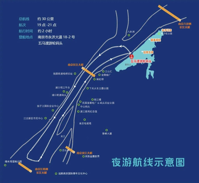 游轮夜航线按水上项目“环形返还”的线路模式,从五马渡游轮码头出发,沿途经过南京长江大桥、铁路轮渡栈桥旧址、浦口轮渡码头、中山码头、阅江楼、下关火车主题公园、映虹桥等等10余处沿江知名人文及自然景观点。
