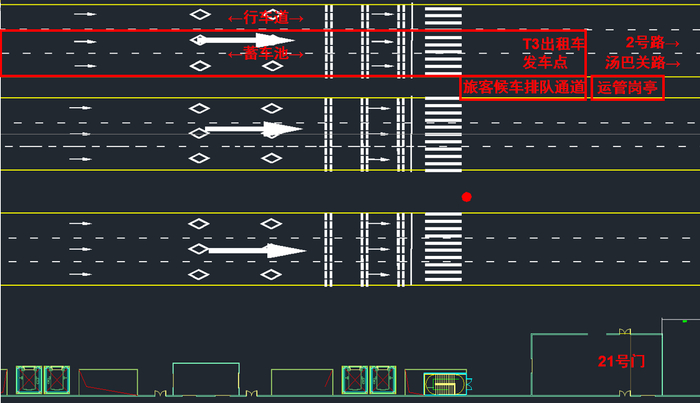 T2出租车乘车点不变(11号门对面),T3发车点设置在1F21号门对面最外侧出租车道上,3号航站楼前最西侧道路为行车道(严禁停车、蓄车),行车道东侧2条相邻车道为出租车蓄车车道,同步配备运管岗亭,T3蓄车通道约400米。