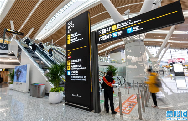 三层出发层是一个下沉花园,由9根立柱立体化展示贵州9个市州悠久的历史文化特色。16、24号门为出口,18、22号门为进口,和以往人工查验的方式不同,进入T3航站楼无需拿出手机出示健康码、行程码,只需用身份证在自助防疫闸机上刷一下,等待系统几秒钟,通过防爆检查环节便可从进入办理自助值机、托运行李、大件行李托运、公安制证等。