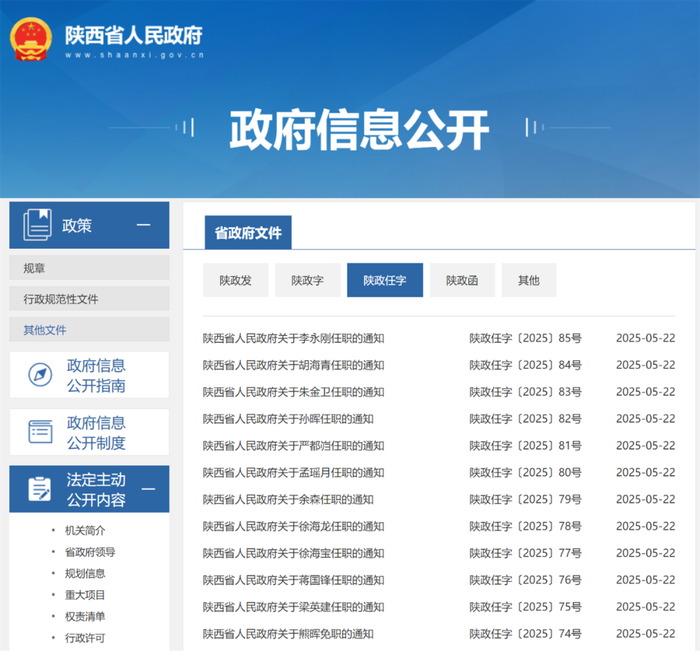 5月22日,陕西省人民政府网站发布一批人事任免通知。