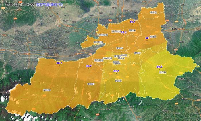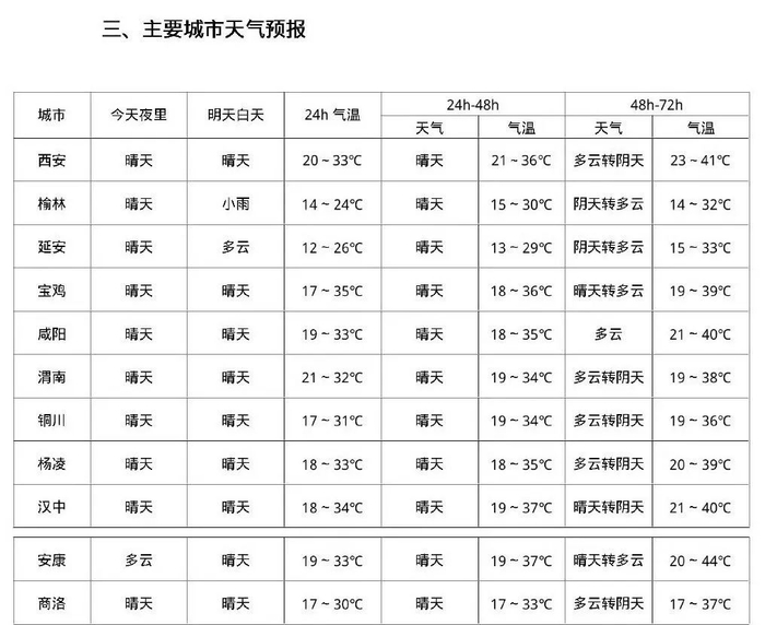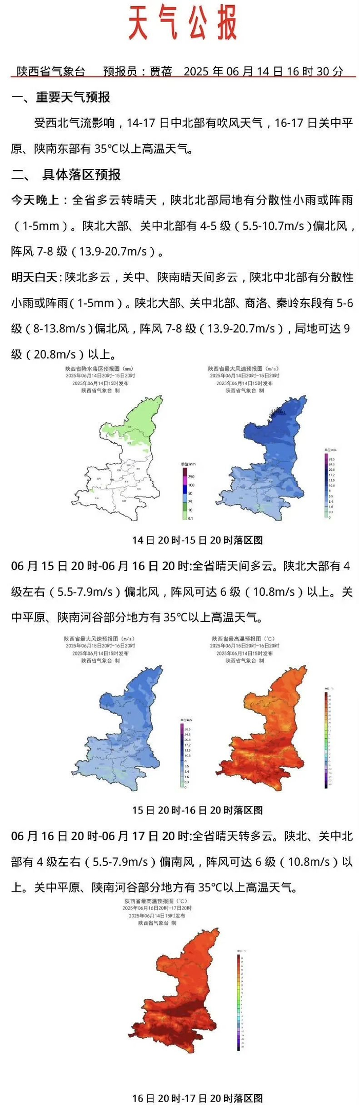 受西北气流影响,14-17日中北部有吹风天气,16-17日关中平原、陕南东部有35℃以上高温天气。