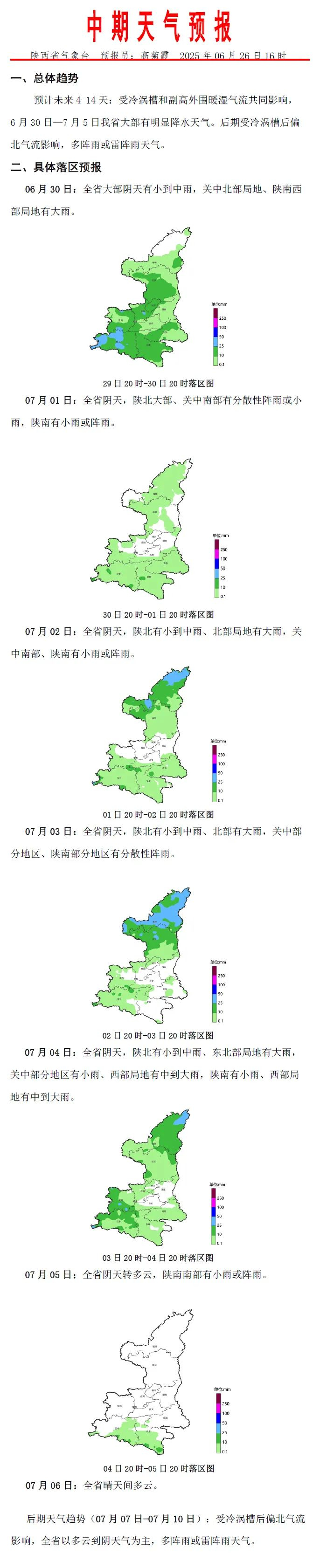 预计未来4-14天:受冷涡槽和副高外围暖湿气流共同影响,6月30日—7月5日我省大部有明显降水天气。后期受冷涡槽后偏北气流影响,多阵雨或雷阵雨天气。
