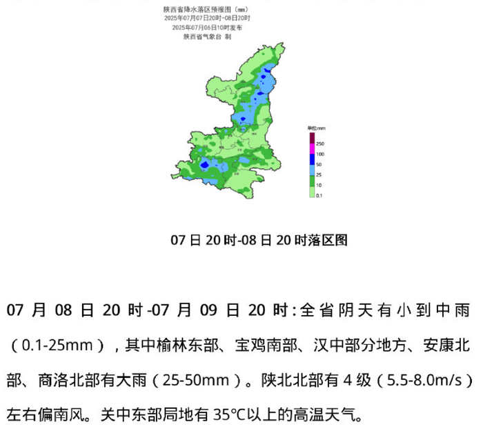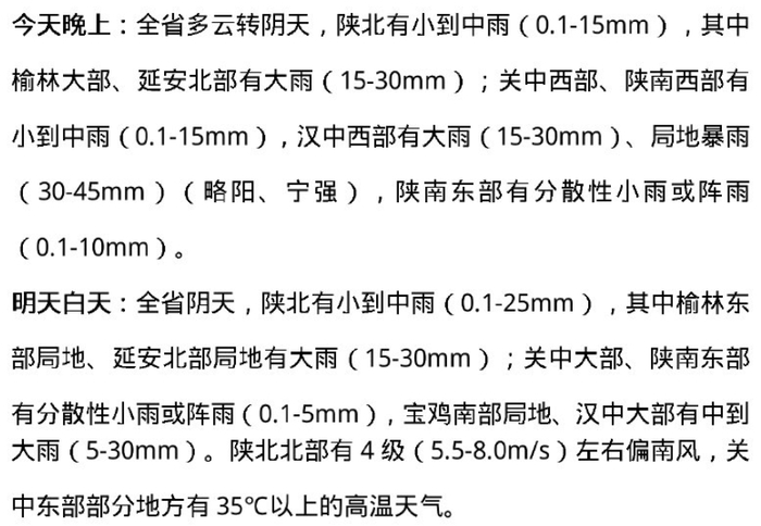 受高空槽和副高外围暖湿气流共同影响,预计未来三天全省大部有降水天气,其间局地伴有短时暴雨、雷暴大风等强对流天气。关中东部、陕南东部局地有 35℃以上的高温天气。