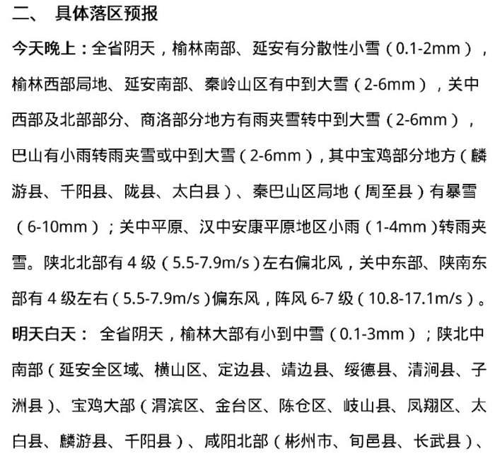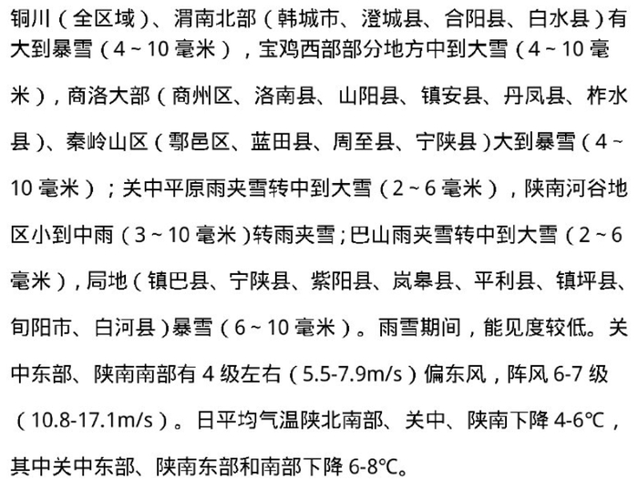 雨雪:今天夜间雨雪自西向东逐渐开始(主城区开始时间在今天后半夜),主要降水集中在明天白天,明天夜间减弱结束。降水期间存在雨雪转换,主城区及平原地区今天夜间为小雨或雨夹雪(0.5~3毫米),明天中午前后雨夹雪转小到中雪(5~7毫米)。南部山区今天夜间雨夹雪转小到中雪(1~5毫米),明天白天大雪(5~8毫米),长安、蓝田山区局地暴雪(10~12毫米);明天夜间全市小雪(0.5~1毫米)。积雪深度主城区0~2厘米,平原地区1~4厘米,秦岭山区3~10厘米。过程期间易出现低能见度天气。