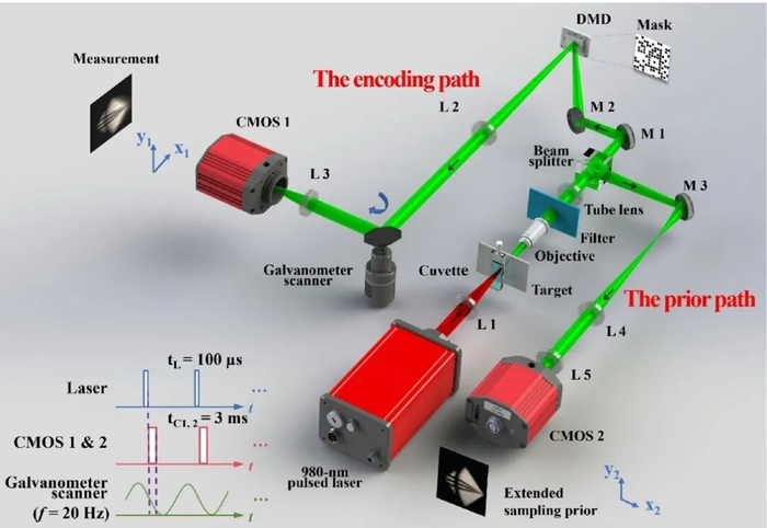 基于多先验物理增强深度学习的压缩高速成像光路在此基础上,研究团队进一步构建了基于双光路同步采集与多先验物理增强深度学习融合的压缩高速成像系统。该系统采用脉冲激光作为激发光源,并通过数字微镜器件(DMD)加载伪随机图案对动态场景进行空间编码。动态场景的光信号被划分为两个路径:在编码路径中,通过振镜扫描将时间信息转化为空间剪切偏移,并由CMOS相机捕获;在先验采样路径中,另一台同步的CMOS相机直接采集场景的未编码积分图像。系统通过数字延迟发生器与信号发生器协同调度,实现对光源、振镜与双相机的精密同步控制。最终,该系统结合人工智能赋能的图像重建方法,在维持高空间分辨率的同时,实现了高保真的高速动态成像。
