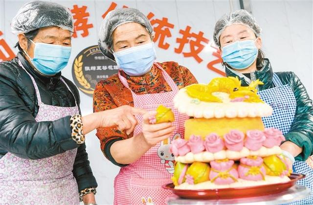 龙年春节期间,村里有对新人结婚想定制一份花馍。为此,张绵便构思了上下三层的《盘龙送喜》花馍,以盘龙和喜字为主,玫瑰、牡丹等花朵造型围绕,中间还配有“福袋”和“石榴”,突出喜庆和祝福。类似的情况还有很多,张绵都会根据需求构思不同的造型,将不同的寓意融入花馍当中。