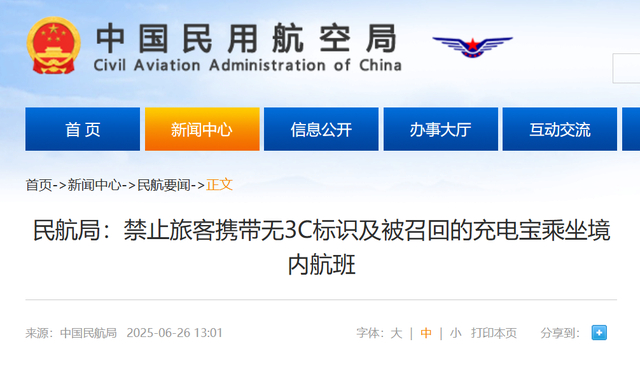 为切实保障航空运行安全,民航局发布紧急通知,自6月28日起禁止旅客携带没有3C标识、3C标识不清晰、被召回型号或批次的充电宝乘坐境内航班。