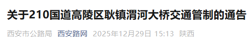 210国道K1215+848处(高陵境内)耿镇渭河大桥因病害严重被评定为四类危桥,按照西安市公路局《关于国道210耿镇渭河大桥实施交通管理的紧急通知》要求,需对该桥梁进行进一步检测、评定、审批和维修加固。为确保该工程顺利开展及过往车辆及行人安全,现对耿镇渭河大桥实施交通管制。