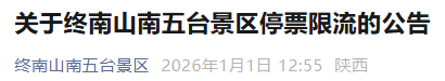 截至1月1日13:00,终南山南五台景区当日门票预约量已达日接待最大承载量。为提升广大游客的游览体验,请已预约的游客按预约时间前来参观游览;未预约到门票的游客可选择其他日期进行预约和游览。