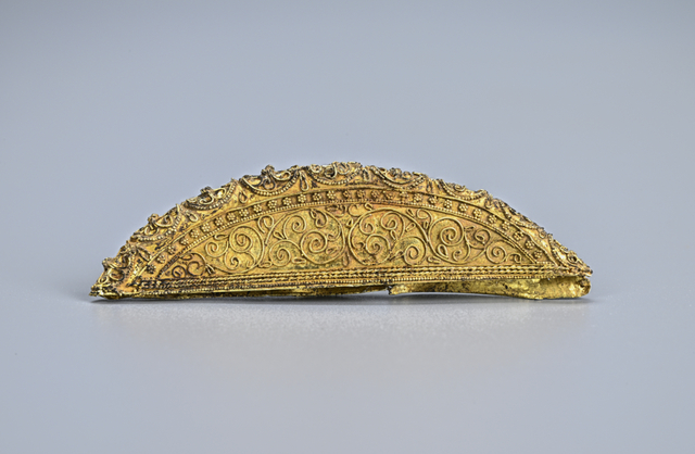 由两层月牙形金片合成,表面纹饰由掐丝及炸珠工艺制成。正背两面主纹饰为左右对称的卷草纹,边缘以两条金丝组成纹带,带内焊缀金粟花纹及联珠纹,底部两组绞丝纹。脊上排列九组金丝宝相花,边缘焊缀联珠纹。梳背中空,内残留块状白色包含物(牙质)。