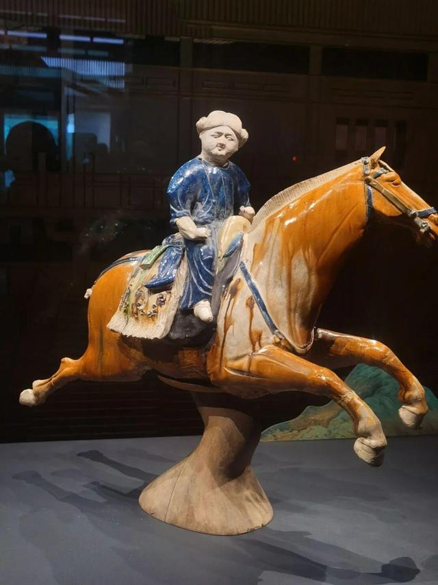 西安博物院的唐代三彩腾空马堪称珍品,1966年出土于西安莲湖区,由骑手与奔马组成,造型动感十足,在唐代马文物中绝无仅有,尽显工匠艺术功底。
