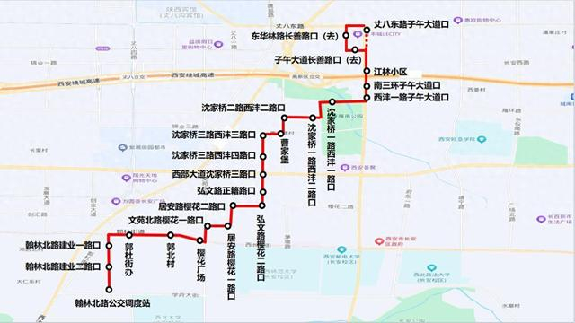 去程由翰林北路公交调度站发车,经翰林北路、郭杜东街、文苑北路、樱花一路、沣经四路、樱花二路、弘文路、沈家桥三路、西沣三路、沈家桥二路、西沣二路、沈家桥一路、西沣一路、子午大道、长善路、西华林路、丈八东路、子午大道至丈八东路子午大道口;回程由丈八东路子午大道口发车,经子午大道、西沣一路、沈家桥一路、西沣二路、沈家桥二路、西沣三路、沈家桥三路、弘文路、樱花二路、沣经四路、樱花一路、文苑北路、郭杜东街、翰林北路至翰林北路公交调度站。线路长度约9公里。首班6:30 ,末班22:00,实行无人售票两元一票制,可刷卡。