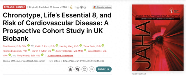 研究截图研究人员表示,“晚睡晚起型”的人生物钟与自然昼夜不匹配,且更有可能伴随饮食质量差、吸烟等影响心血管健康的行为。