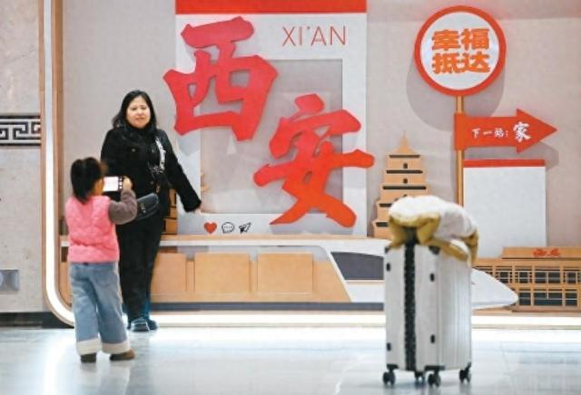 2月2日,旅客在西安站候车大厅的主题文化墙前留影。(新华社记者李一博摄)2月2日,2026年春运开启。在西安站、西安北站、西安咸阳国际机场等交通枢纽,一段关于出行与团圆的叙事,如期展开。