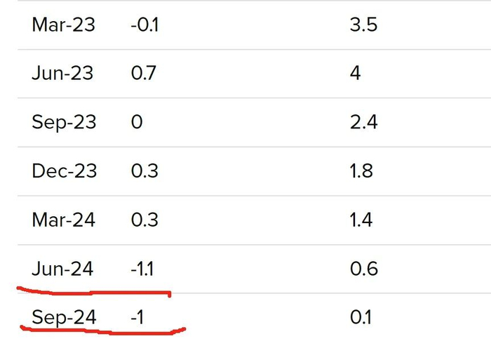 此前的2024年6月季度GDP经修订后下降1.1%。统计局数据截屏(前一个季度增长率,后一个为年度增长率):