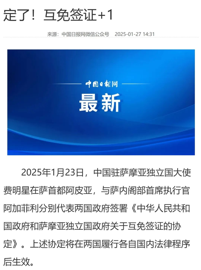 协议生效后,萨摩亚和中国公民可以互相免签访问对方国家,免签最长停留30天。