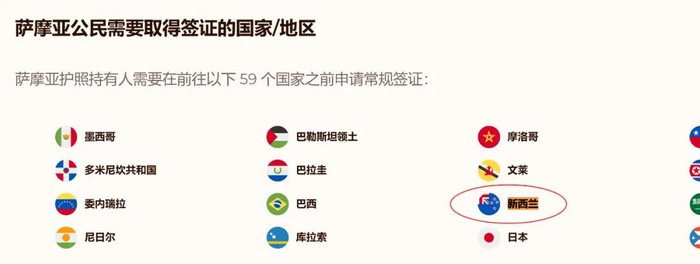 萨摩亚人需要在前往59个国家/地区之前申请常规签证,而这之中,就包含“友好邻邦”新西兰: