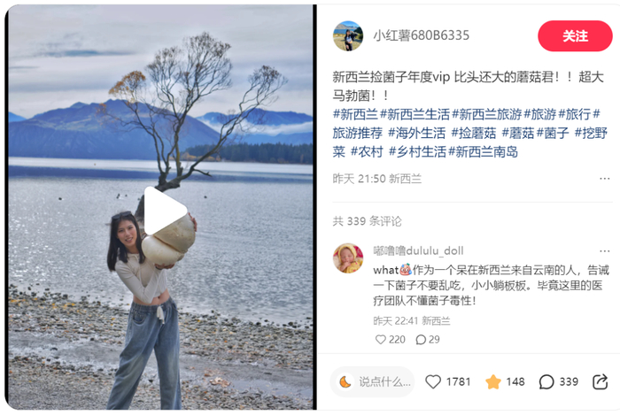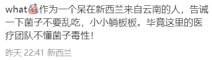 “作为一个待在新西兰来自云南的人,告诫一下菌子不要乱吃,小心躺板板。毕竟这里的医疗团队不懂菌子毒性!”