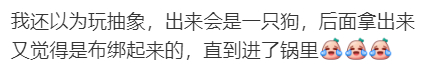 “我还以为玩抽象,出来会是一只狗,后面拿出来又觉得是布绑起来的,直到进了锅里。”