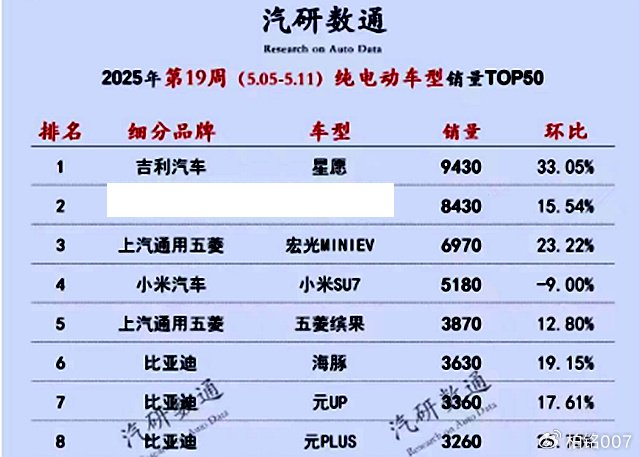 汽研数通公布的2025年第19周国内纯电汽车热销车型排名数据,数据显示热销纯电车型第一名并非的电车一哥的车型,而是一家传统汽车企业,这对电车行业来说无疑是巨大的变化,预示着电车市场正在发生变局。